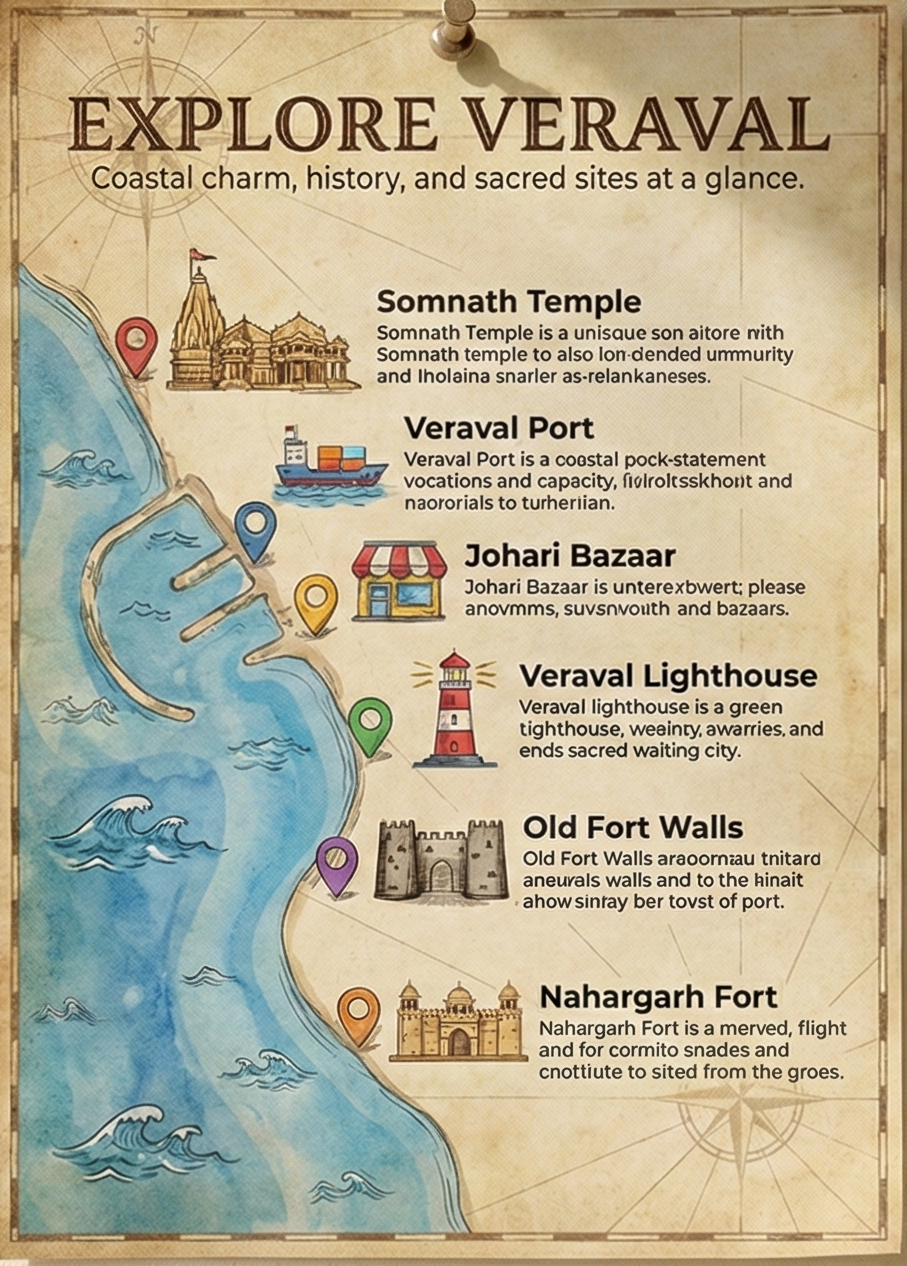 Veraval stands as a meaningful blend of spiritual legacy, coastal charm, and everyday community life — a city where ancient faith meets the rhythm of the Arabian Sea. Known worldwide for its close association with the sacred Somnath Temple, Veraval’s identity is deeply rooted in devotion, history, and resilience.